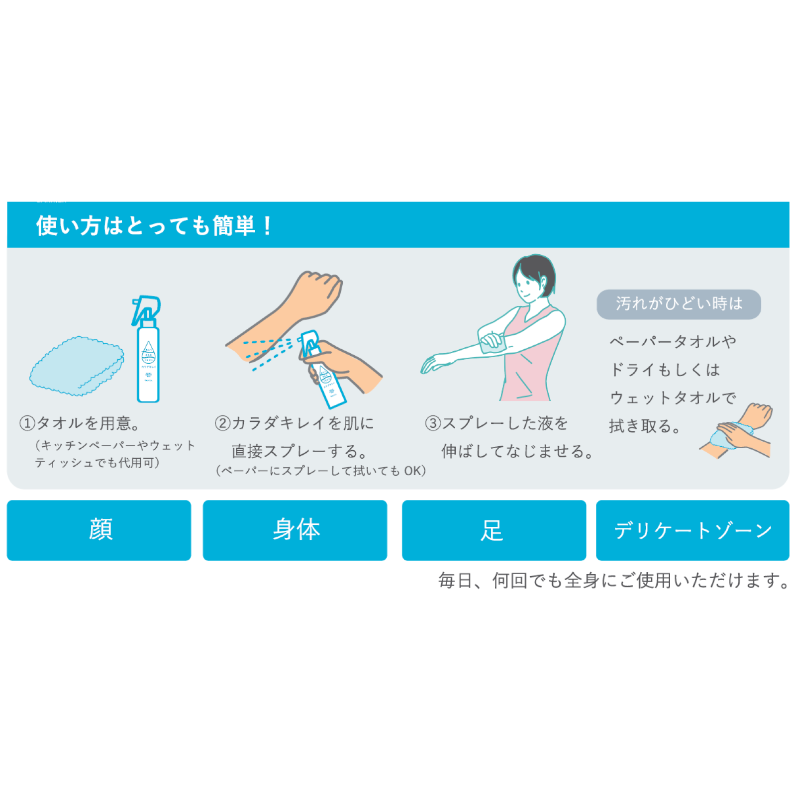スプレーしてさっと拭き取るだけの洗浄型保湿ローション。